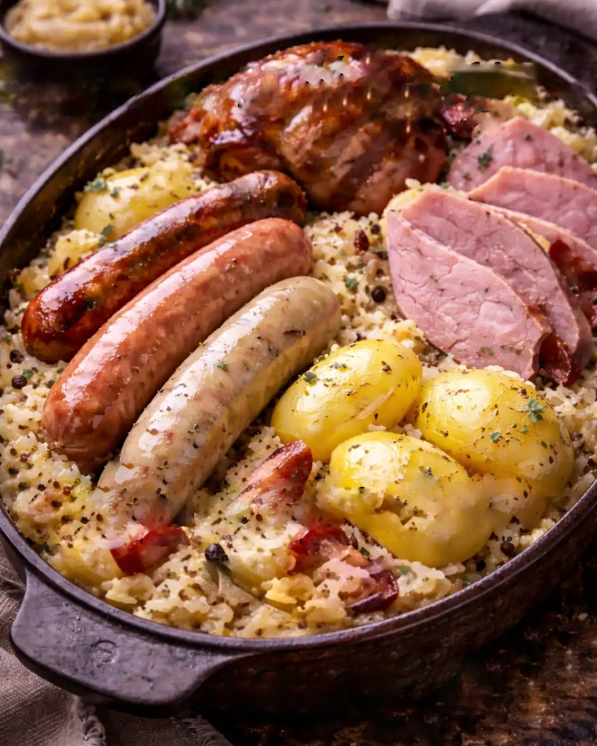Choux à choucroute, porc fumé, poitrine, saucisse de Strasbourg, vin blanc, oignon, ail, grains de poivre noir, pomme de terre